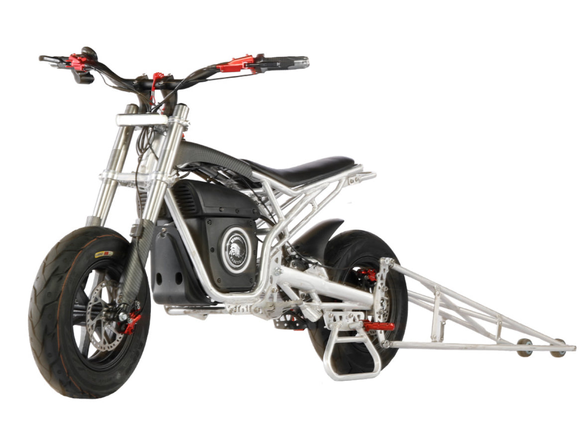 Burromax XRA Drag Racer - 4.0kw (4000w) Motor, 72v 20Ah Lithium Ion Battery, +120mm Extended Swing Arm, Aluminum Racing Frame, Super Moto street ires, Anodized hydraulic brake levers and calipers, start/stop kill switch and tether. XRA is shown without plastics and will ship with black carbon fiber plastics. We estimated a top speed of 60+ mph depending on riding conditions and rider weight.
