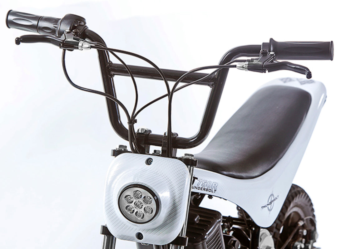 Everyone who gets on the TT750 Thunderbolt says "Whoa - that's got a lot of torque!" - Its the fun kind for adults 16 and over. This will be your go to pit bike and it's already traveling the woods with hunters and putting smiles on faces at events. This bike has a lot of hit when you twist the throttle and should be all you need for this size bike. The TT750R is in a class of its own in the 750W and below electric mini bikes and it will not disappoint on performance. This is the same basic bike as our other TT series bikes with standard features like a front and rear suspension, front and rear disc brake, keyed ignition, variable throttle, and a 20" seat height. The noted exception is the performance specification. In addition it has a standard powerful LED Headlight, a new thin line LED tail light, a digital voltmeter and all bikes come with a taller set of handlebars that will accept our accessory items. Enjoy this one!